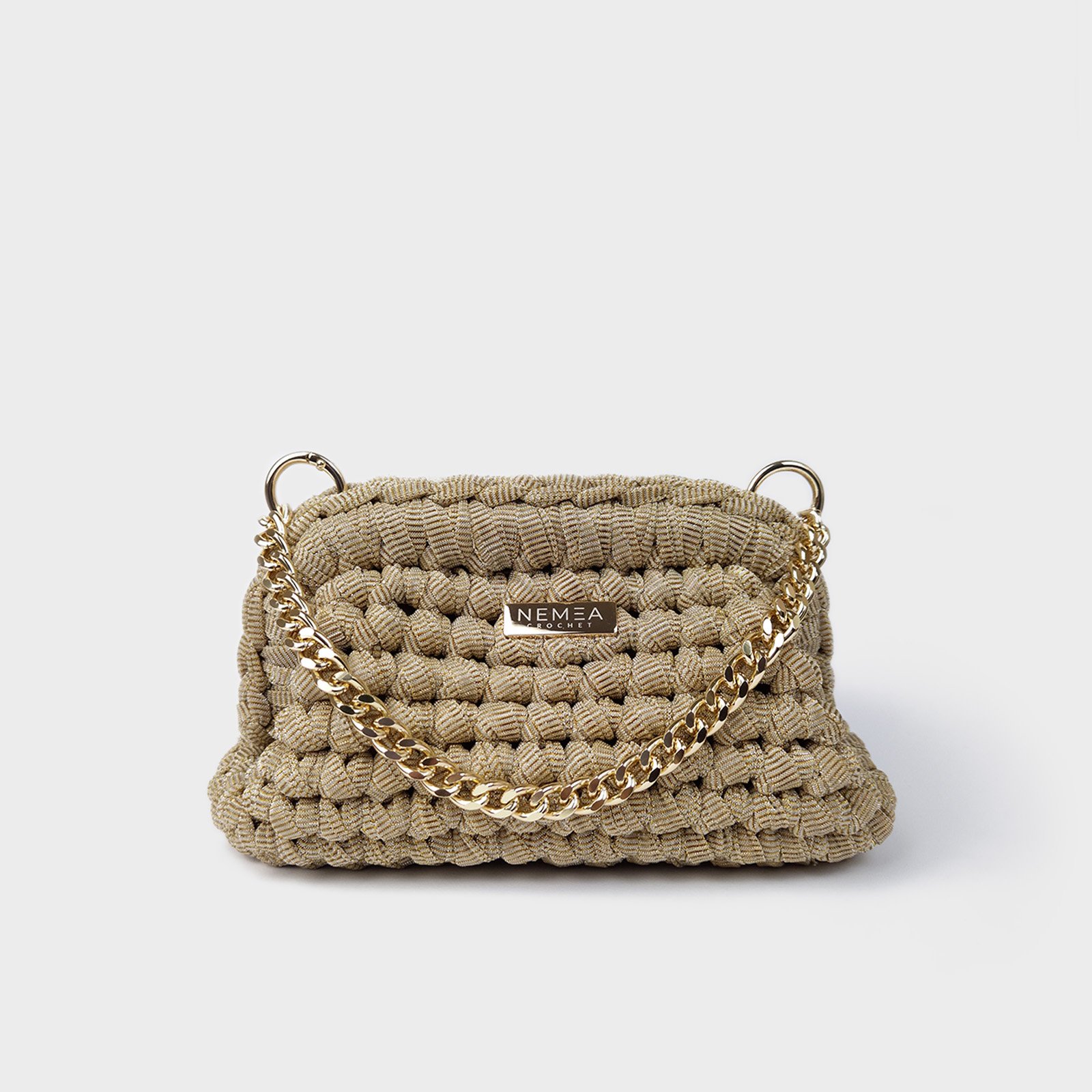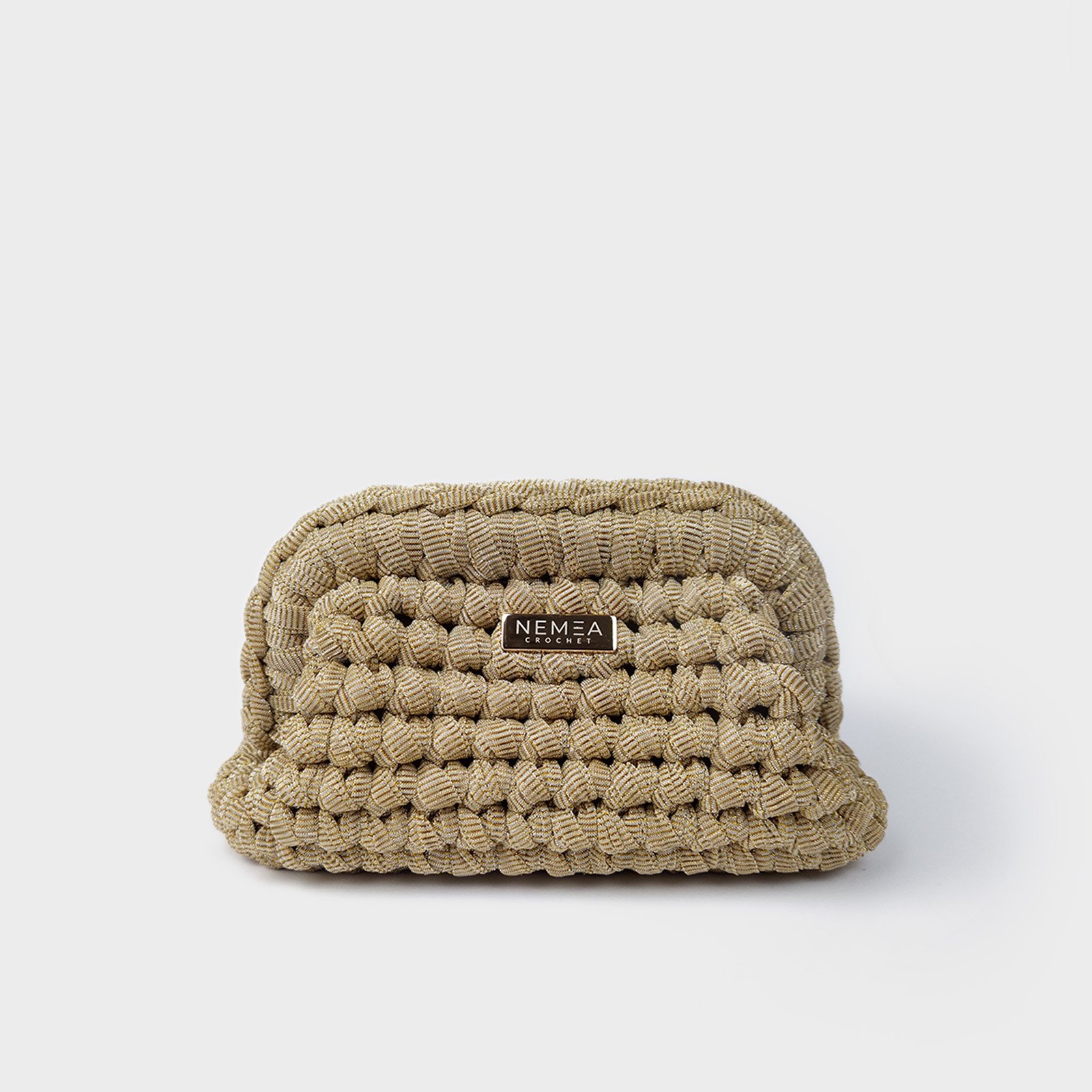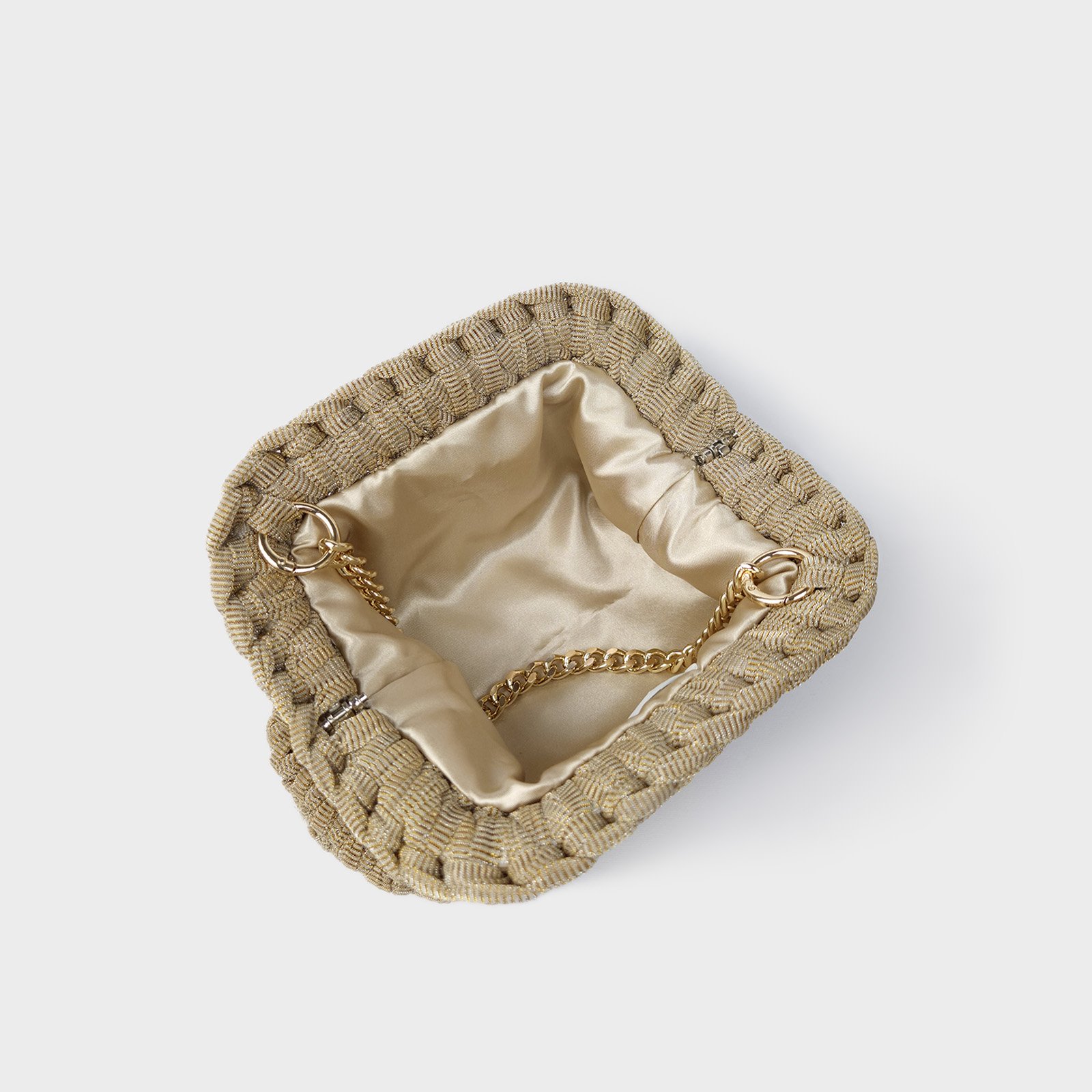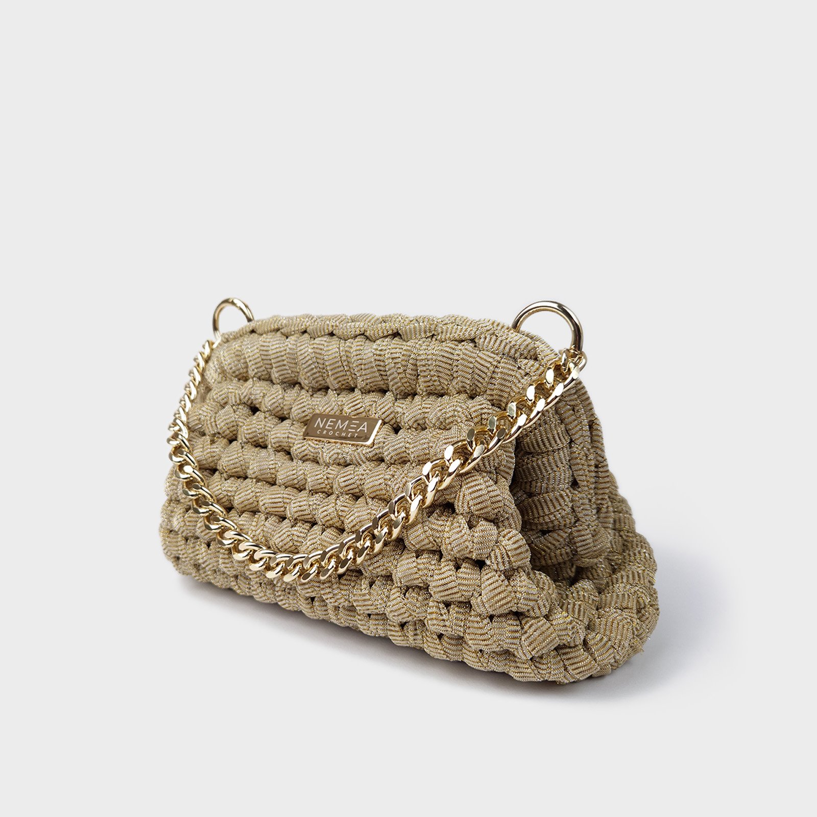 BRIGHT STARDUST is a glitter organza clutch designed for evening use and special occasions. This glitter organza clutch features a compact crochet structure with a luminous champagne finish.