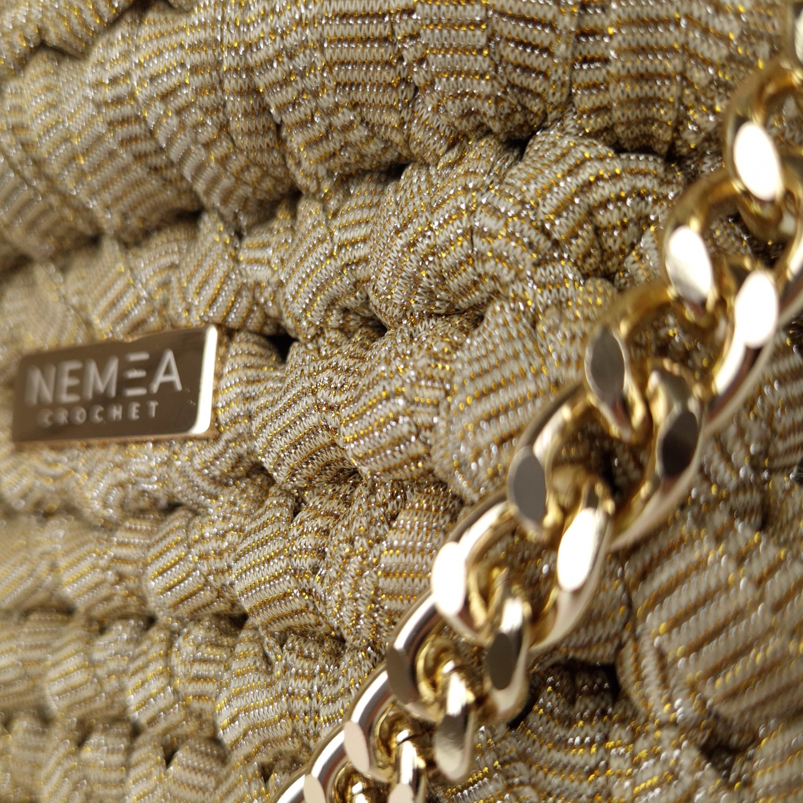 The surface is crafted through a crochet weave of champagne glitter organza, where fine golden filaments create a dense texture punctuated by subtle points of light that reflect movement. The visual effect is luminous yet controlled, designed to enhance evening looks without excess.