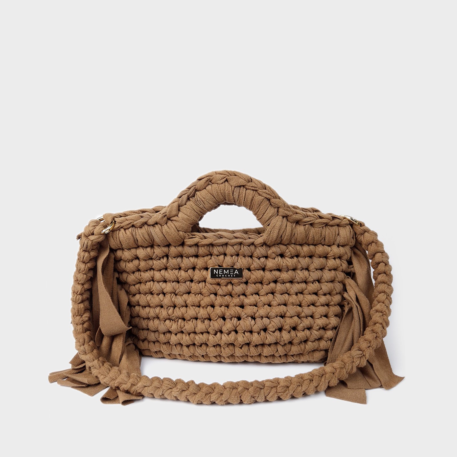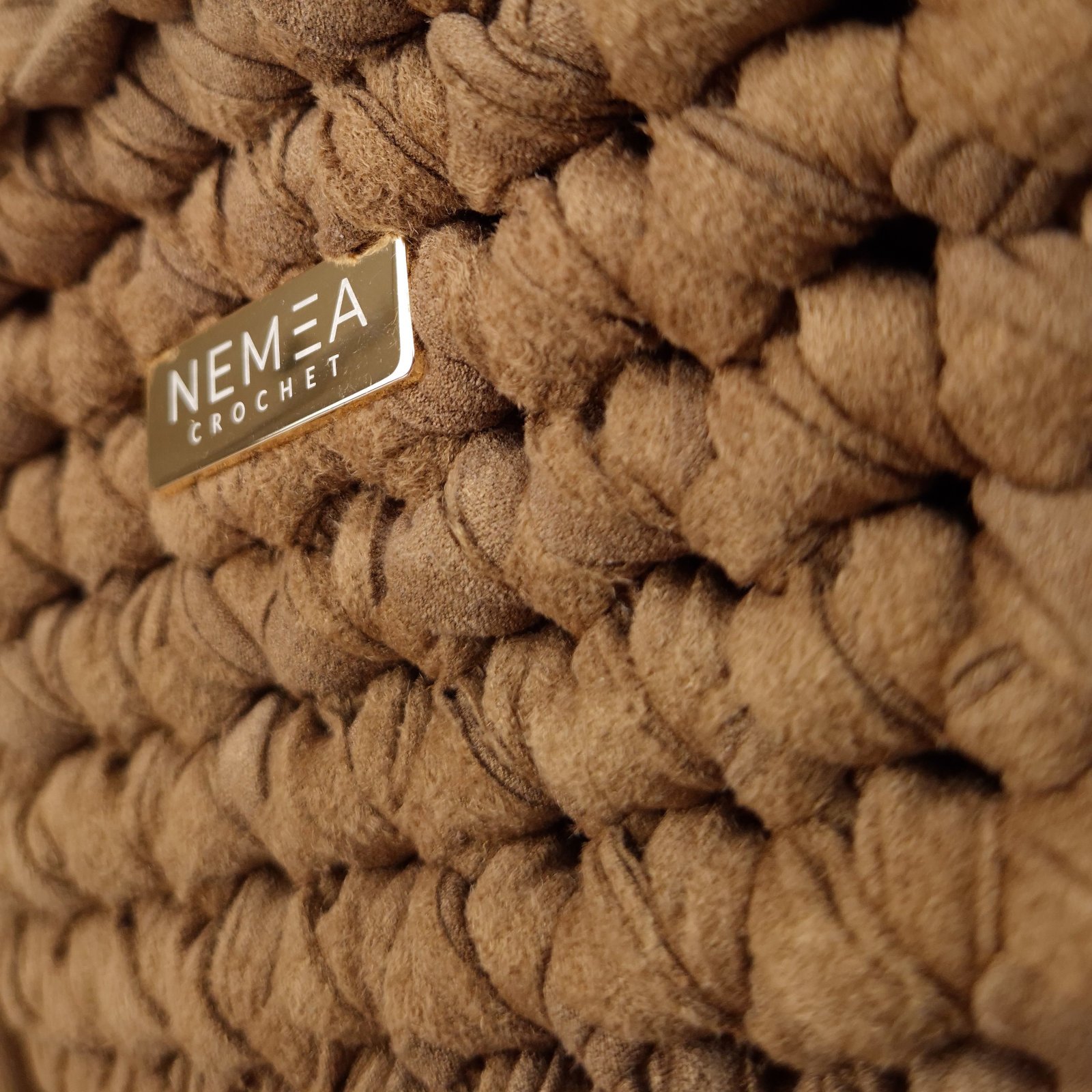 CINNAMON SUEDE is a suede-effect crochet handbag designed in a warm cinnamon tone with a structured yet soft silhouette. This suede-effect crochet handbag is made using elastic suede-style yarn worked in a compact stitch to ensure stability and durability.