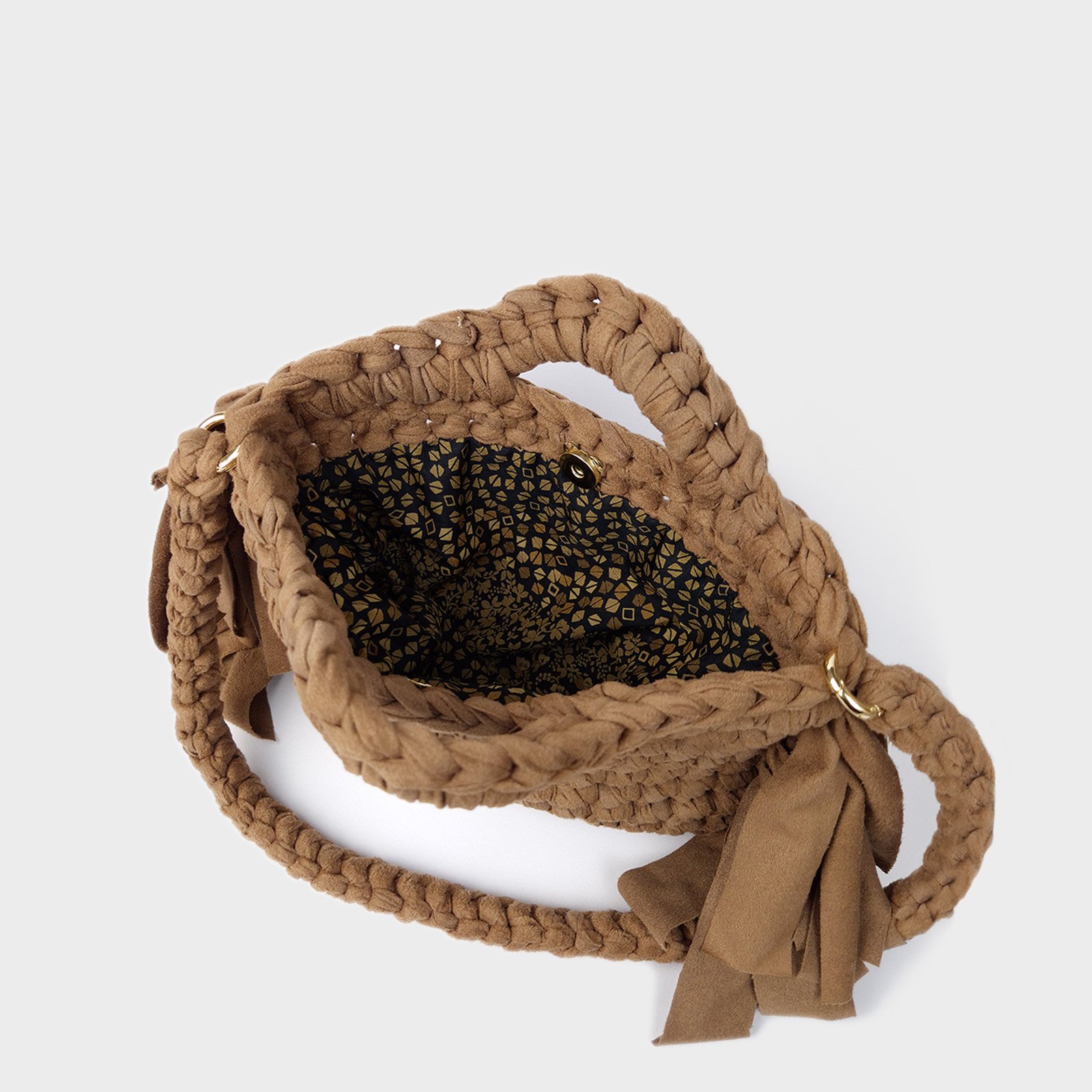 The reinforced upper edge defines the top handle, while the removable crochet shoulder strap allows flexible everyday use. Inside, a geometric-pattern lining adds a subtle graphic contrast, complemented by side fringes that soften the overall structure.
