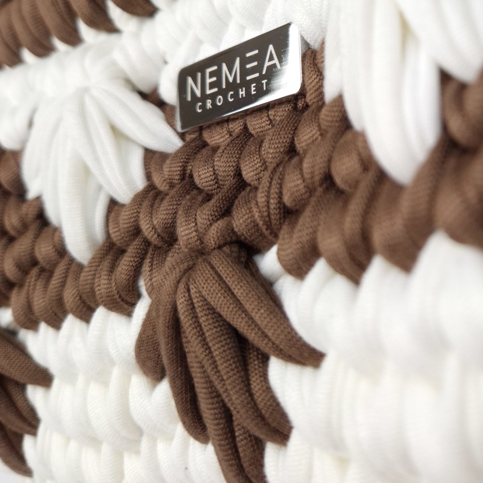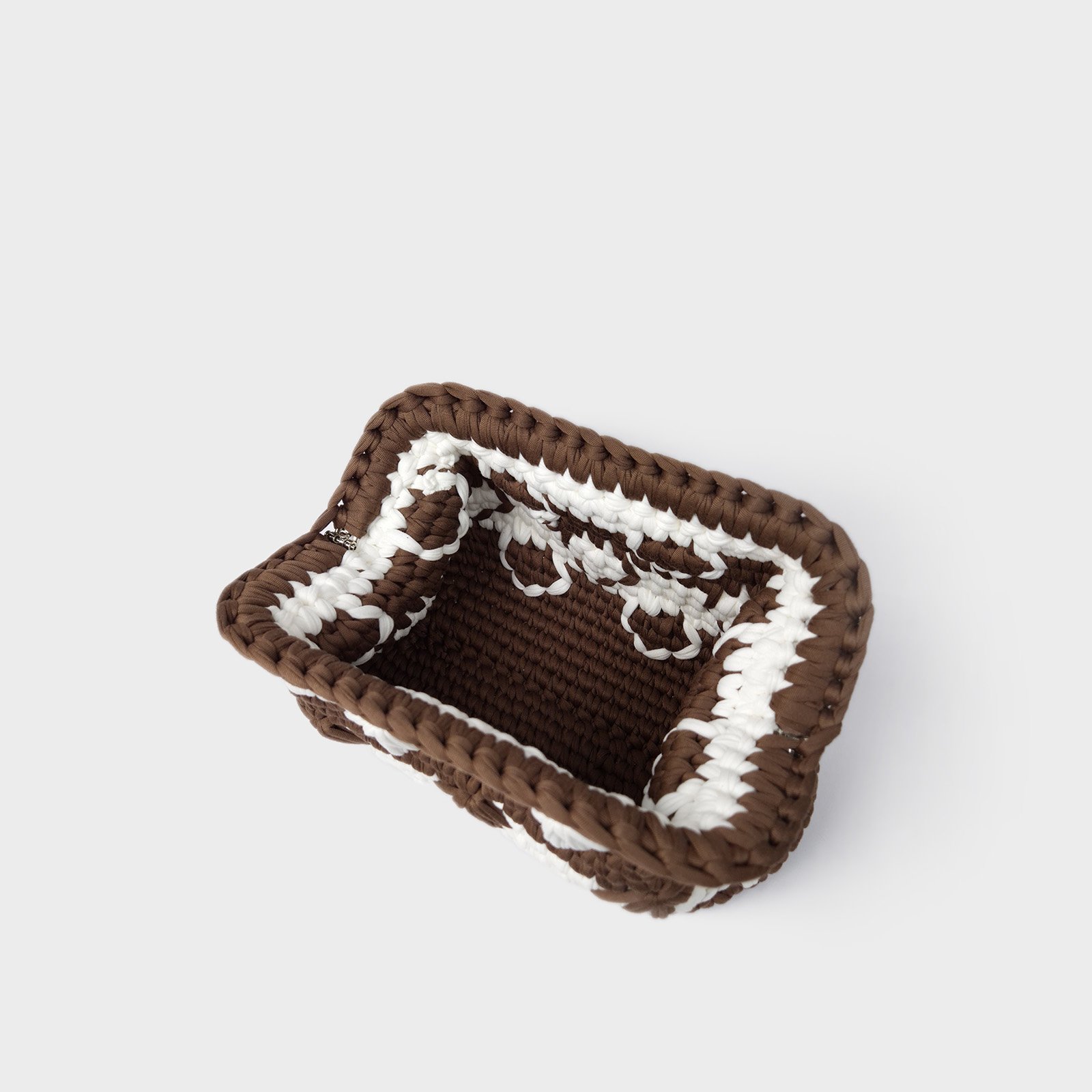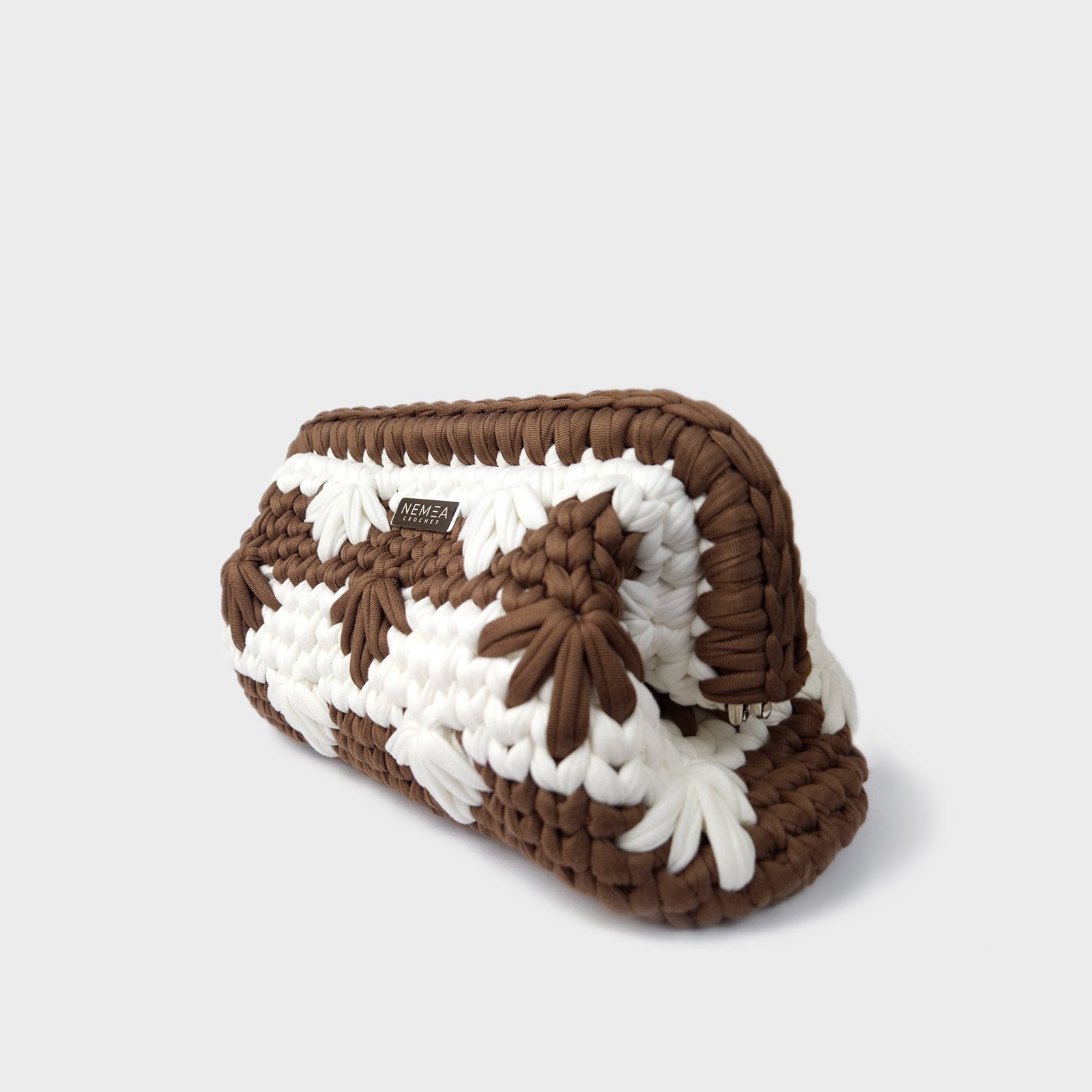 COCOA FEATHER is a crochet clutch bag designed with a raised feather pattern. This crochet clutch bag features alternating cocoa and milk white bands, combined with a textured feather motif that adds visual movement to the surface.