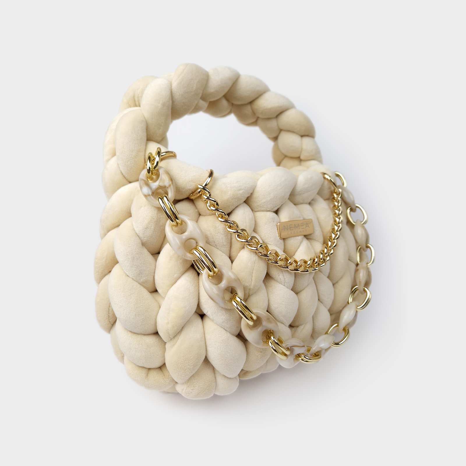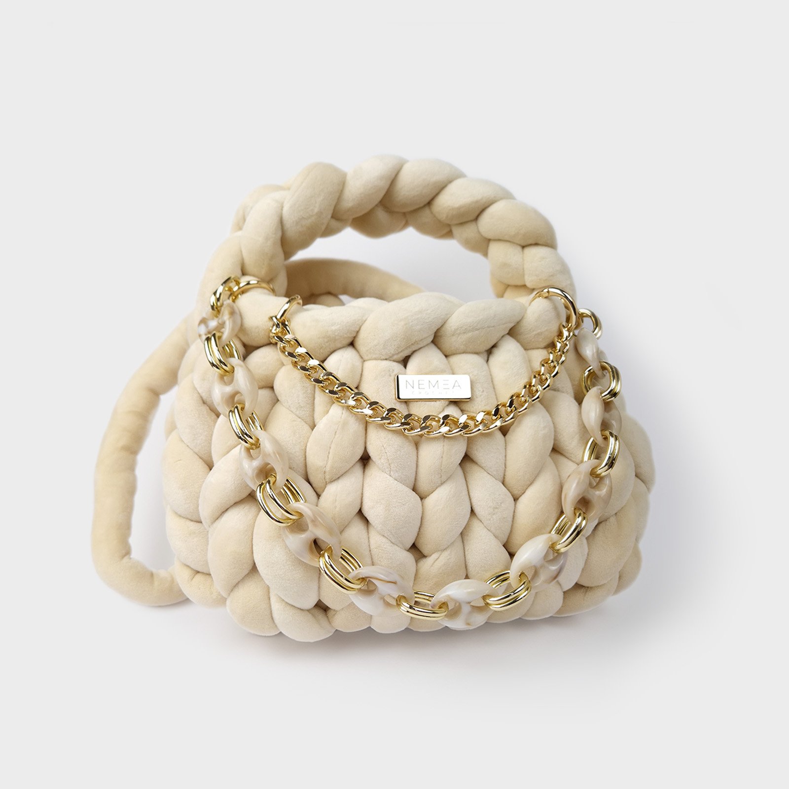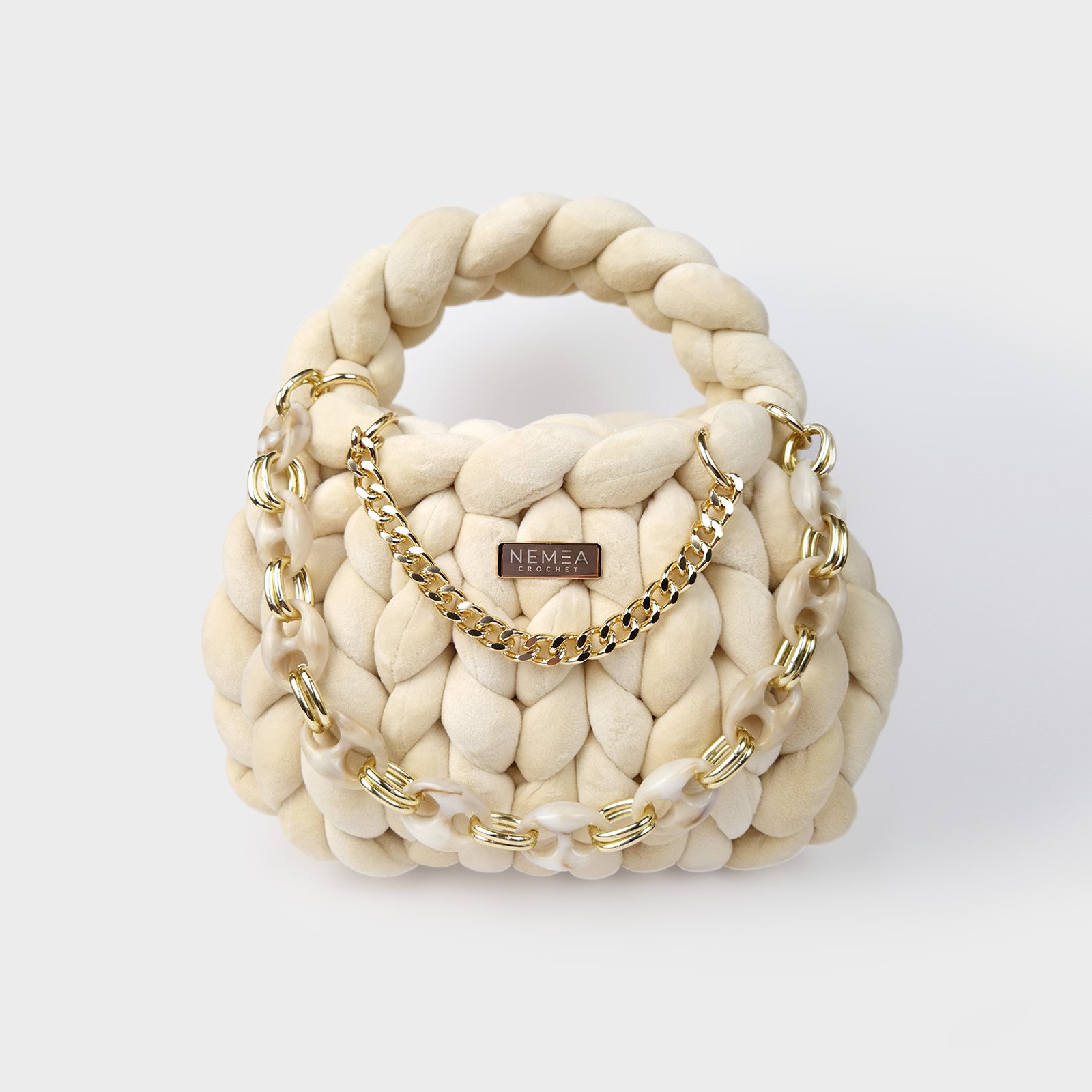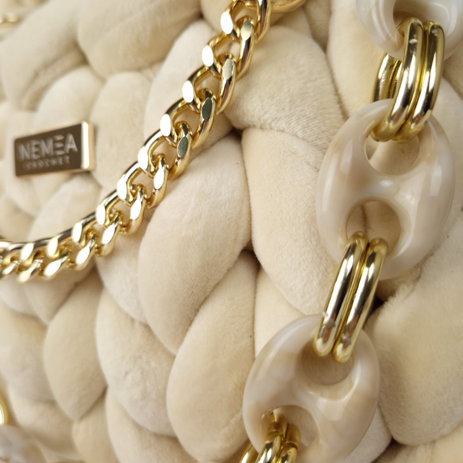 The velvet marshmallow yarn builds a soft, dimensional structure. A rounded top handle allows comfortable hand carry, while a fixed shoulder strap supports everyday use. Two removable decorative chains—one gold and one ivory—add a jewelry-inspired detail that can be styled or removed.