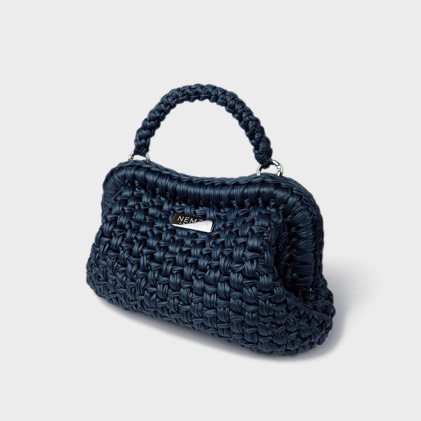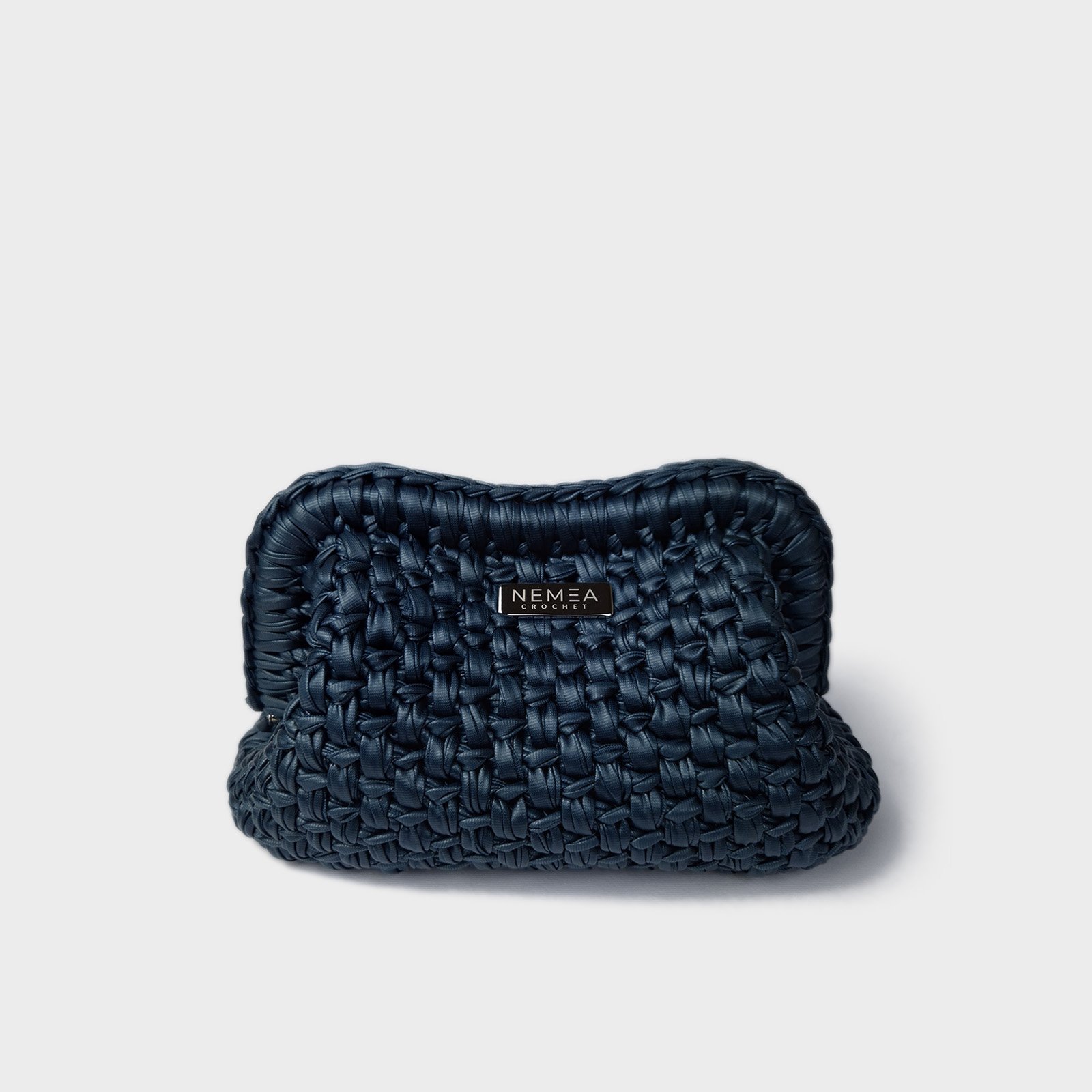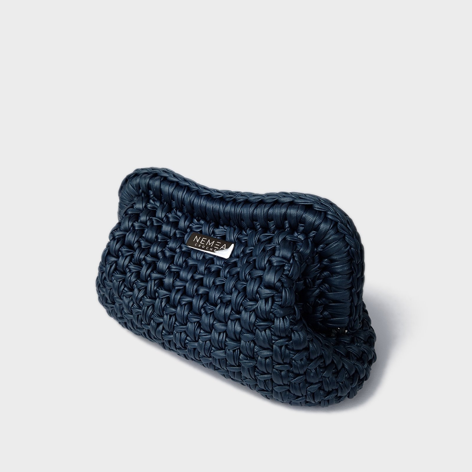 The premium vegan leather yarn is crocheted to create a stable yet soft structure, maintaining clean lines and a refined surface. A removable matching crochet handle allows versatile styling, transforming the clutch into a sleek evening accessory.