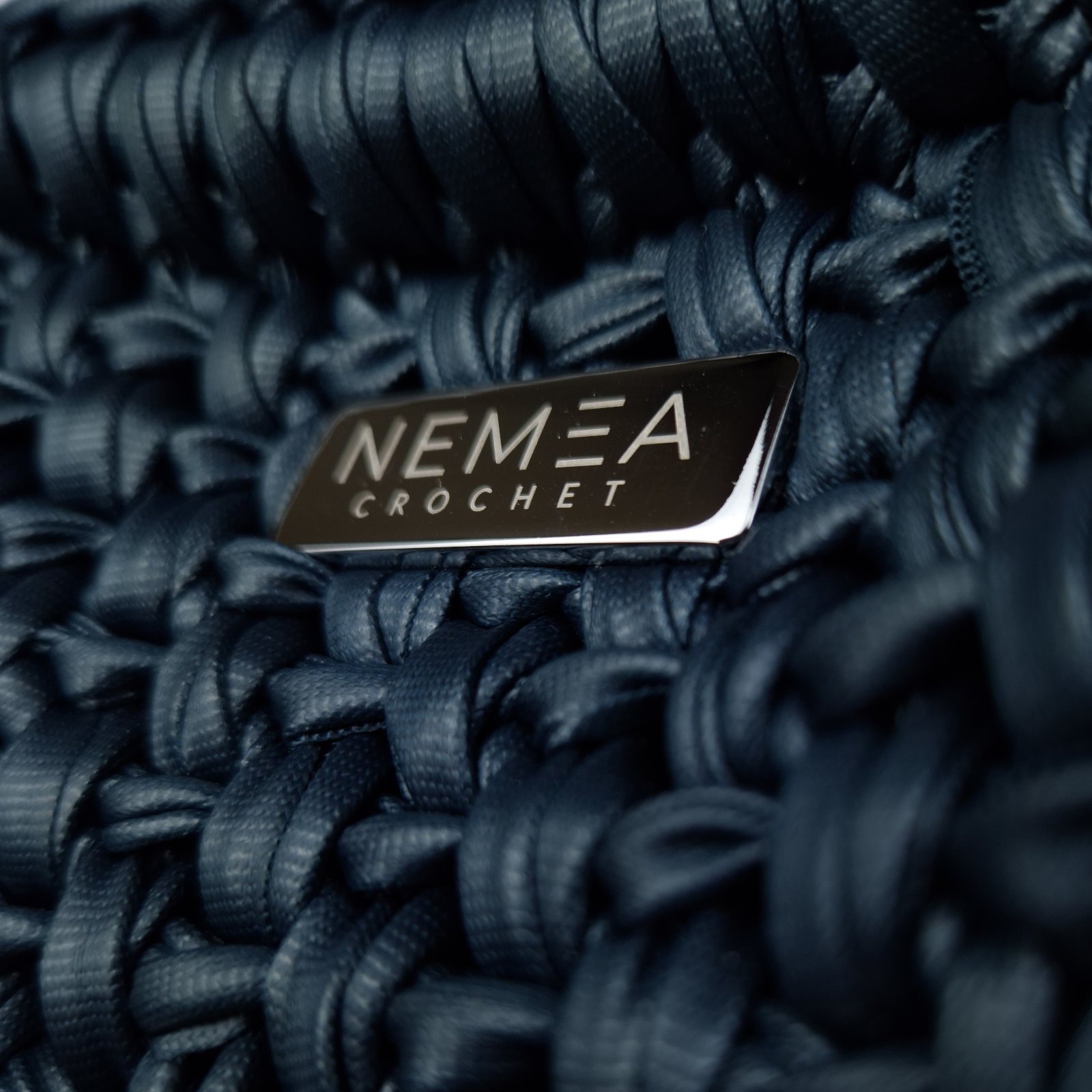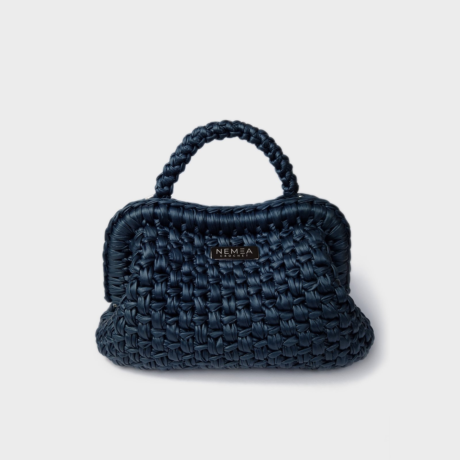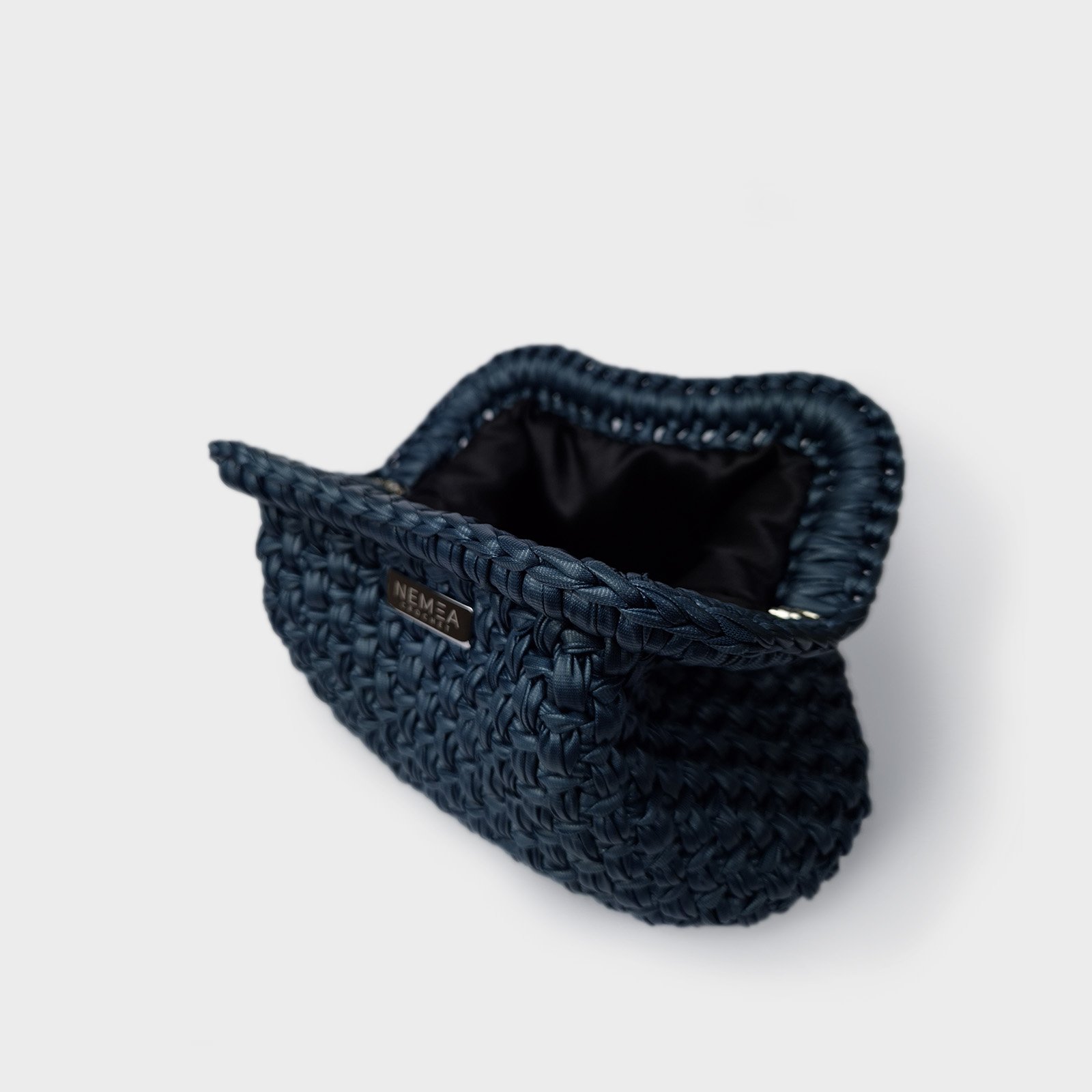 The premium vegan leather yarn is crocheted to create a stable yet soft structure, maintaining clean lines and a refined surface. A removable matching crochet handle allows versatile styling, transforming the clutch into a sleek evening accessory.